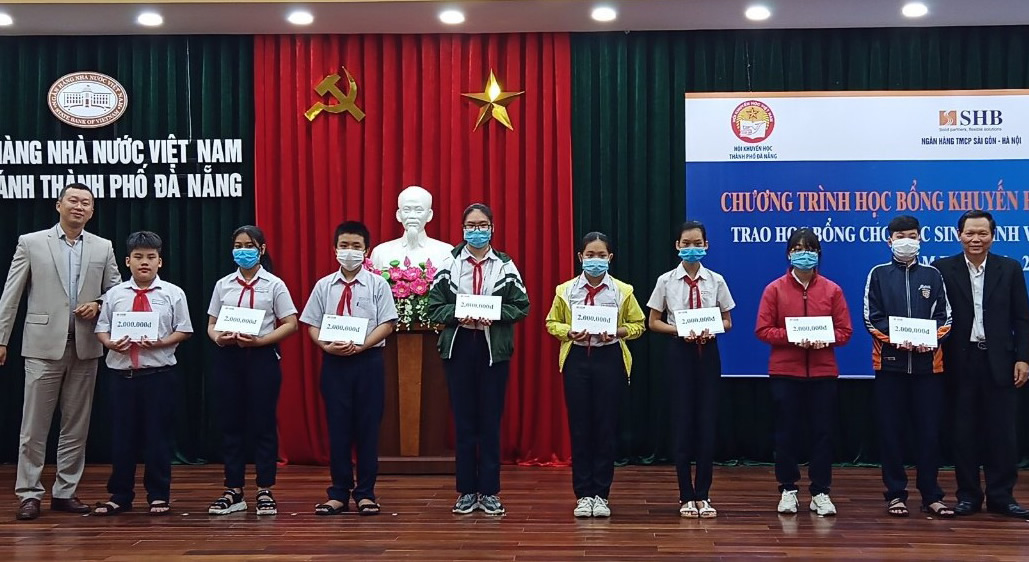 ĐÀ NẴNG- Sáng 25-12, Hội Khuyến học TP phối hợp cùng Ngân hàng Nhà nước Việt Nam chi nhánh Đà Nẵng tổ chức trao học bổng khuyến học ngành Ngân hàng Đà Nẵng cho HS-SV Đà Nẵng vượt khó hiếu học năm học 2020-2021. Đợt này, có 35 HS, SV được nhận học bổng với tổng trị giá 100 triệu đồng do Ngân hàng thương mại cổ phần Sài Gòn - Hà Nội (SHB) tài trợ, trong đó 10 SV nhận học bổng mỗi suất 5 triệu đồng và 25 HS nhận học bổng mỗi suất 2 triệu đồng.