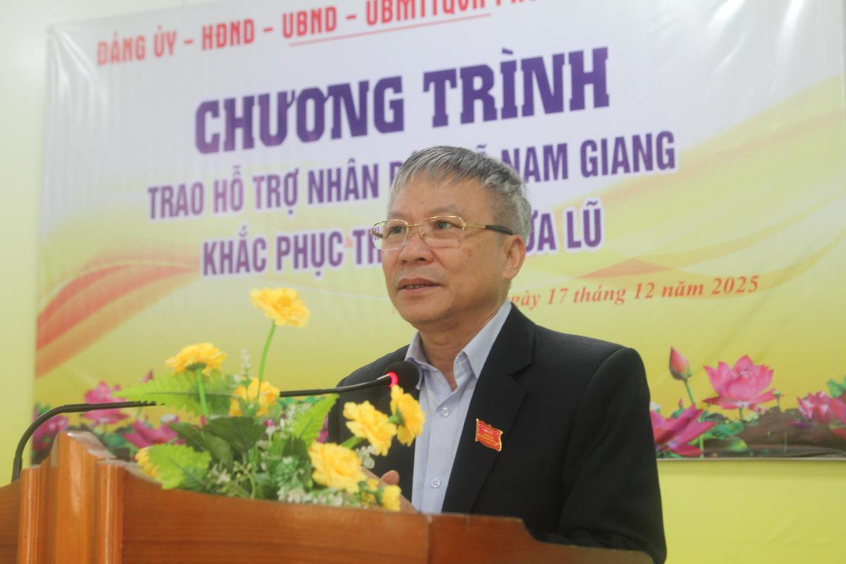 Phát biểu tại buổi trao hỗ trợ, Chủ tịch HĐND thành phố Nguyễn Đức Dũng ghi nhận và biểu dương nỗ lực của Đảng bộ, chính quyền và nhân dân xã Nam Giang cùng nhau đoàn kết, sẻ chia, vượt qua muôn vàn khó khăn, thử thách do thiên tai gây ra.