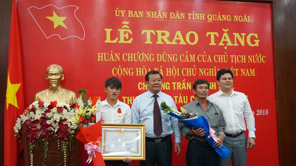 Chiều 21-11, UBND tỉnh Quảng Ngãi tổ chức lễ công bố, trao tặng Huân chương Dũng cảm cho ngư dân Trần Thanh Ron, trú xã Phổ Châu, H. Đức Phổ (Quảng Ngãi) vì hành động đẹp cứu người trên biển.