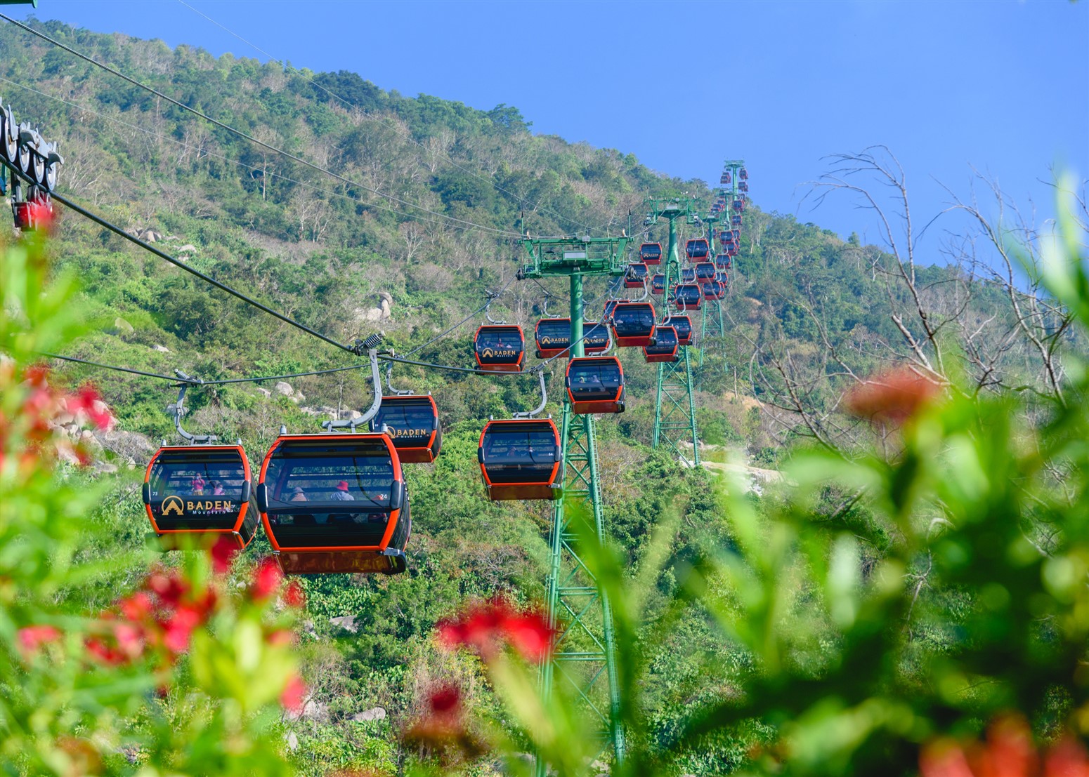 Để tới đồi hoa tulip, bạn đi tuyến cáp treo Vân Sơn lên đỉnh núi Bà, nơi có chóp tháp 986m. Những ngày này cáp treo mở cửa từ sáng tới tối để phục vụ du khách. Trải nghiệm lướt đi giữa lưng chừng mây núi cũng rất thú vị.