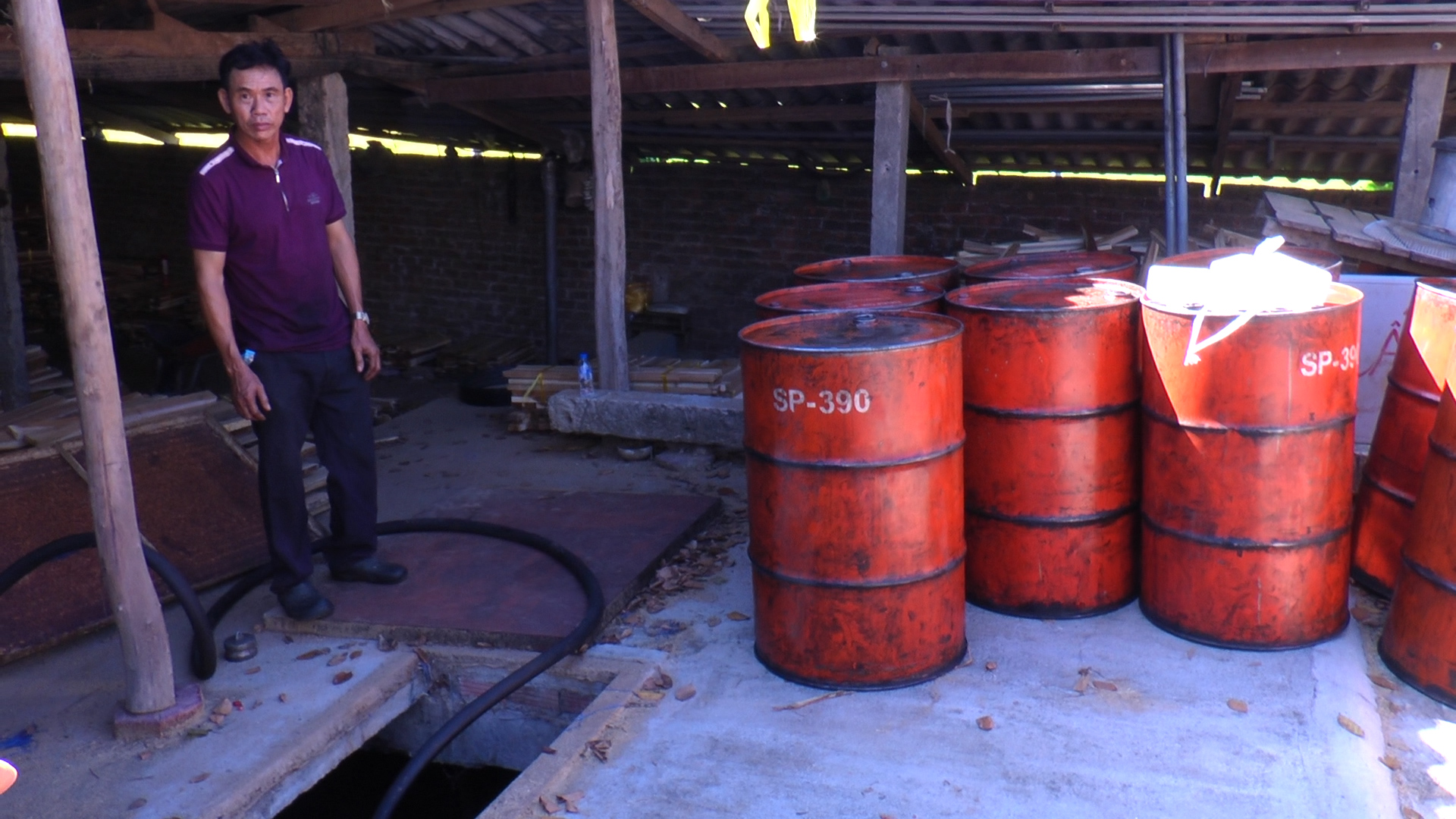 Ông Lê Tấn Hùng bên các thùng phuy dầu giả. |