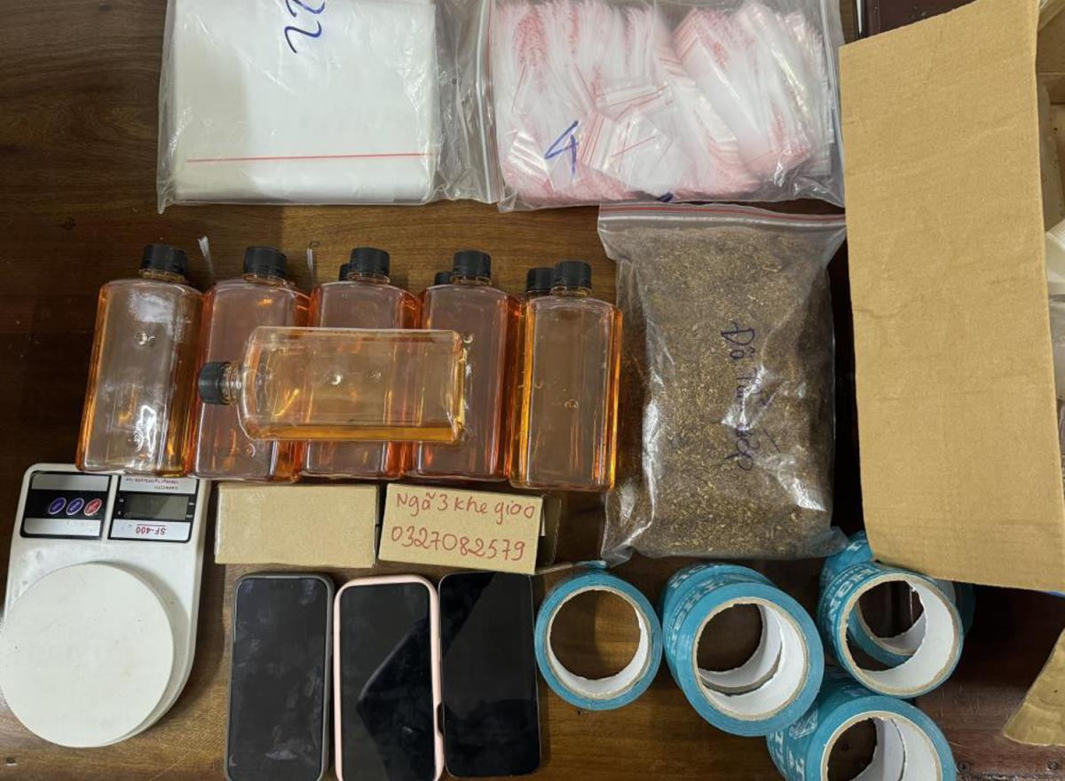 Khám xét khẩn cấp nơi ở của 2 đối tượng nói trên, lực lượng chức năng thu giữ khoảng 1 kg ma túy Tobaco thành phẩm, 9kg nguyên liệu thảo mộc khô; 11 chai (5 lít) dung dịch ma túy dùng để tẩm ướp; 200 hộp giấy để đóng gói ma túy; 6 cuộn băng dính, nhiều túi zip để chia nhỏ; 1 cân tiểu ly và nhiều tài liệu, vật chứng liên quan khác.
