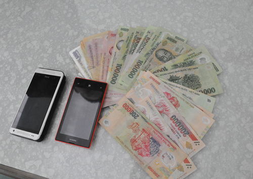 | Thiện và các con bạc cùng tang vật vụ án. |