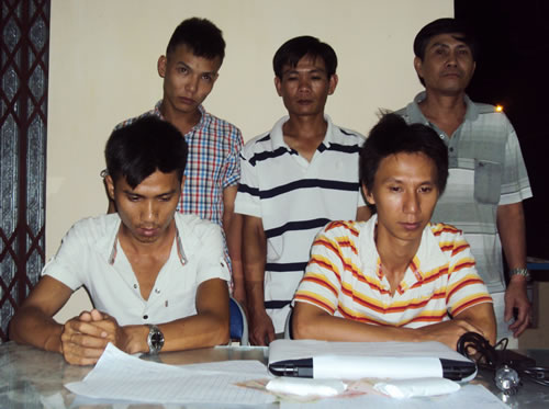 | Dũng, Minh (ngồi) cùng các con bạc và tang vật vụ án. |