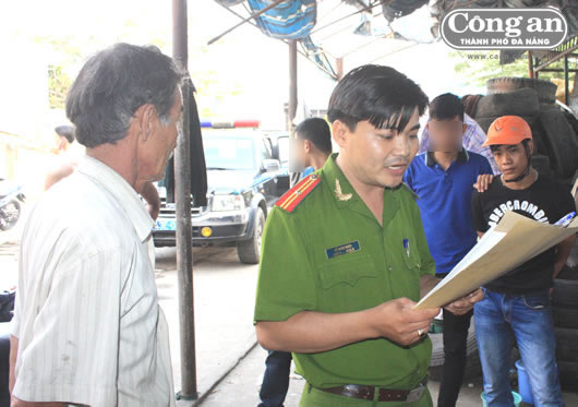 Thiếu tá Hồ Ngọc Bách - Đội phó Đội CSMT CAQ Cẩm Lệ công bố quyết định khám xét khẩn cấp nơi làm việc của Lê Duy Long. |