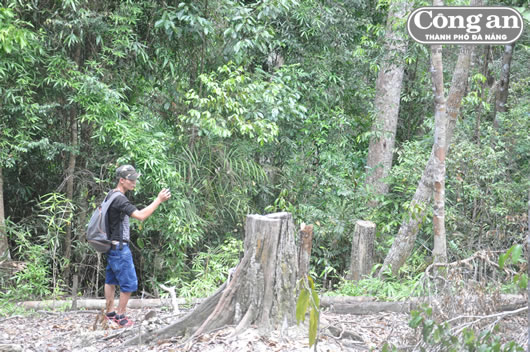 Lực lượng CA tỉnh Quảng Nam đánh dấu số cây gỗ bị đốn hạ. |