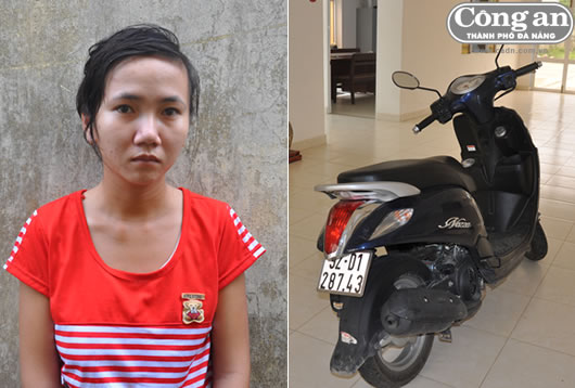 Mạc Thị Bảo Yến và tang vật xe máy của bị hại. |