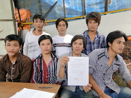 Các ngư dân trên tàu ông Trần Thế Anh với tờ biên bản phía Trung Quốc xử phạt. |