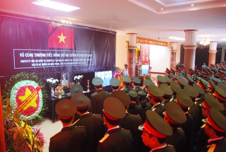 Đúng 7 giờ sáng, hàng nghìn người dân tề tựu về UBND tỉnh để làm Lễ truy điệu. Tất cả các cán bộ công nhân viên chức các sở ban ngành chức năng đều có mặt để tiễn đưa Đại tướng về nơi an nghỉ cuối cùng.