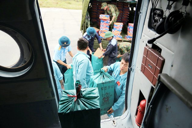 2 máy bay Mi-17 và Mi-171 từ Đà Nẵng được điều động ra sân bay Phú Bài (Thừa Thiên – Huế) để vận chuyển khối lượng lớn lương thực, nước ngọt, các loại nhu yếu phẩm trong điều kiện trời có gió, tầm nhìn hạn chế.