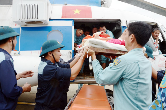 Ngay sau khi đến sân bay Phú Bài, 2 xe cấp cứu quân đội đã nhanh chóng đưa bệnh nhân vào Bệnh viện Trung ương Huế để được hỗ trợ, chăm sóc y tế.