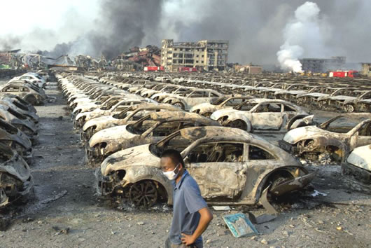 Vụ nổ ở Thiên Tân khiến hàng ngàn ô-tô bị đốt cháy, gây ảnh hưởng nghiêm trọng cho các Cty. Ảnh: AP |