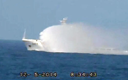Tàu Trung Quốc tiếp tục dùng vòi rồng phun nước vào tàu của Việt Nam. |