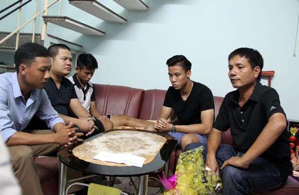 | Quế Ngọc Hải (thứ hai phải sang) và đại diện lãnh đạo CLB SLNA đến nhà hỏi thăm chấn thương của Anh Khoa và mong gia đình tiền vệ SHB Đà Nẵng tha thứ. Ảnh: Q.H |