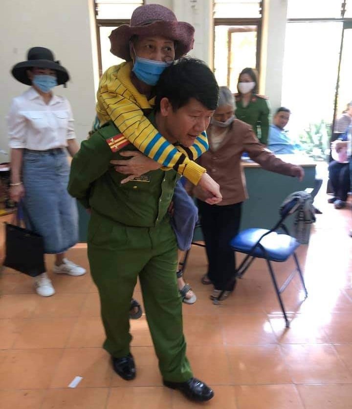 Trung tá Đinh Văn Tuấn cõng bà Vân. |