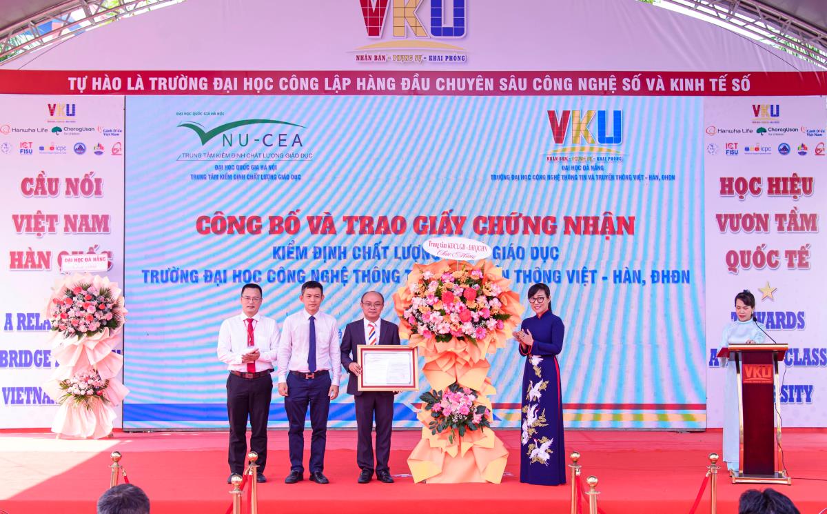 Phát biểu tại buổi lễ, TS. Huỳnh Ngọc Thọ – Phó Hiệu trưởng VKU nhấn mạnh, việc đạt chuẩn kiểm định không chỉ là sự ghi nhận mà còn là minh chứng rõ nét cho uy tín và chất lượng đào tạo của Nhà trường. Đây đồng thời là cam kết mạnh mẽ trong việc tiếp tục cải tiến, nâng cao chất lượng theo các chuẩn mực khu vực và quốc tế, hướng tới mục tiêu đào tạo nguồn nhân lực chất lượng cao trong lĩnh vực công nghệ số và kinh tế số. Thành quả này là kết tinh của quá trình nỗ lực bền bỉ trong xây dựng môi trường giáo dục hiện đại, đổi mới chương trình đào tạo, phát triển đội ngũ giảng viên, đẩy mạnh hợp tác quốc tế và nghiên cứu khoa học, phục vụ cộng đồng.
