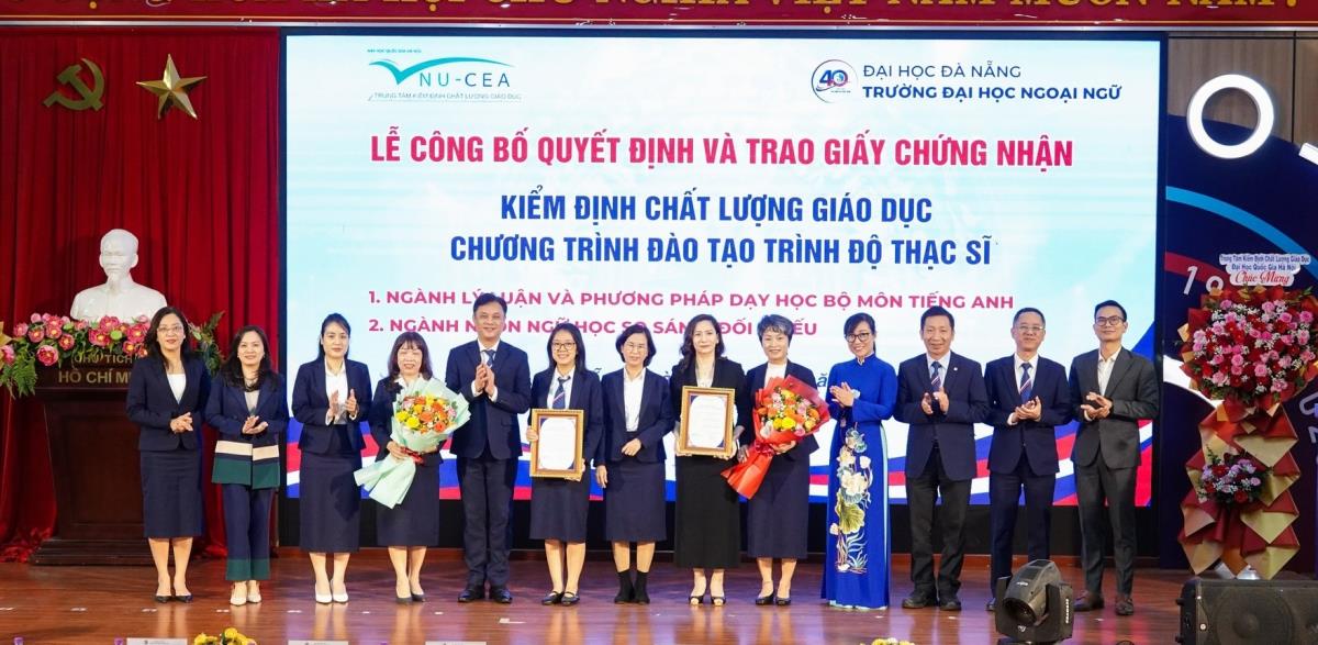 Hai chương trình đào tạo trình độ thạc sĩ gồm: Lý luận & phương pháp dạy học bộ môn Tiếng Anh và Ngôn ngữ học so sánh đối chiếu của Trường Đại học Ngoại ngữ, Đại học Đà Nẵng vừa được Trung tâm Kiểm định chất lượng giáo dục - Đại học Quốc gia Hà Nội công nhận đạt chuẩn kiểm định chất lượng giáo dục với thời hạn 5 năm.