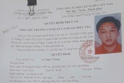 Ngày 11/9, Cơ quan Cảnh sát điều tra Công an tỉnh Lâm Đồng phát đi quyết định truy nã đặc biệt đối với Lê Ngọc Trung (SN 1996, trú phường Mũi Né, tỉnh Lâm Đồng) về tội “Lừa đảo chiếm đoạt tài sản”.