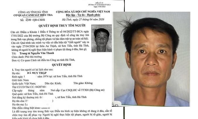 Quá trình xác minh vụ việc có dấu hiệu giết người xảy ra trên địa bàn xã Sơn Tiến vào tối 27-4, bước đầu cơ quan điều tra nghi người có liên quan đến vụ việc là Hà Huy Thập (1974, trú xã Sơn Tiến, Hà Tĩnh), nhưng không rõ đang ở đâu nên ra quyết định truy tìm.