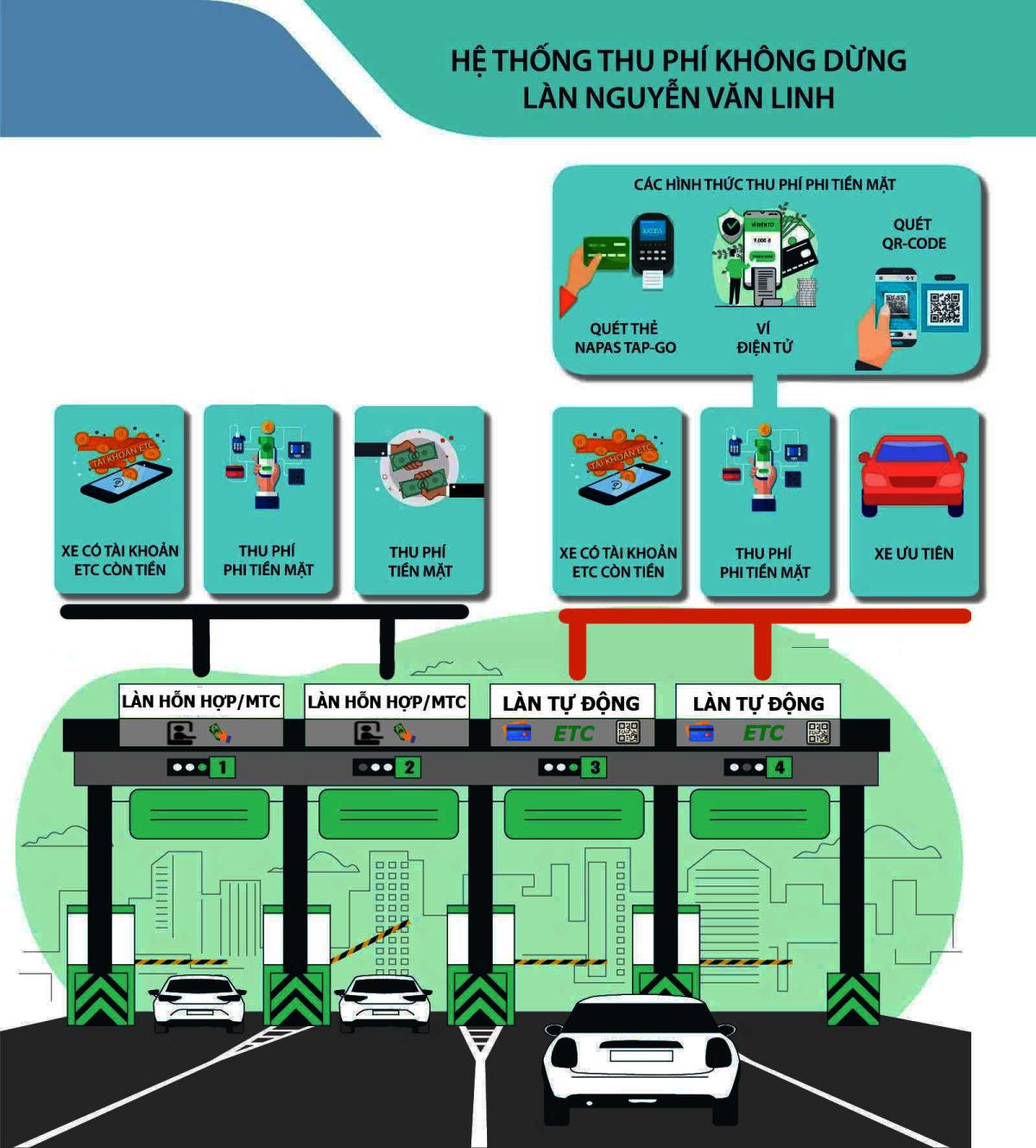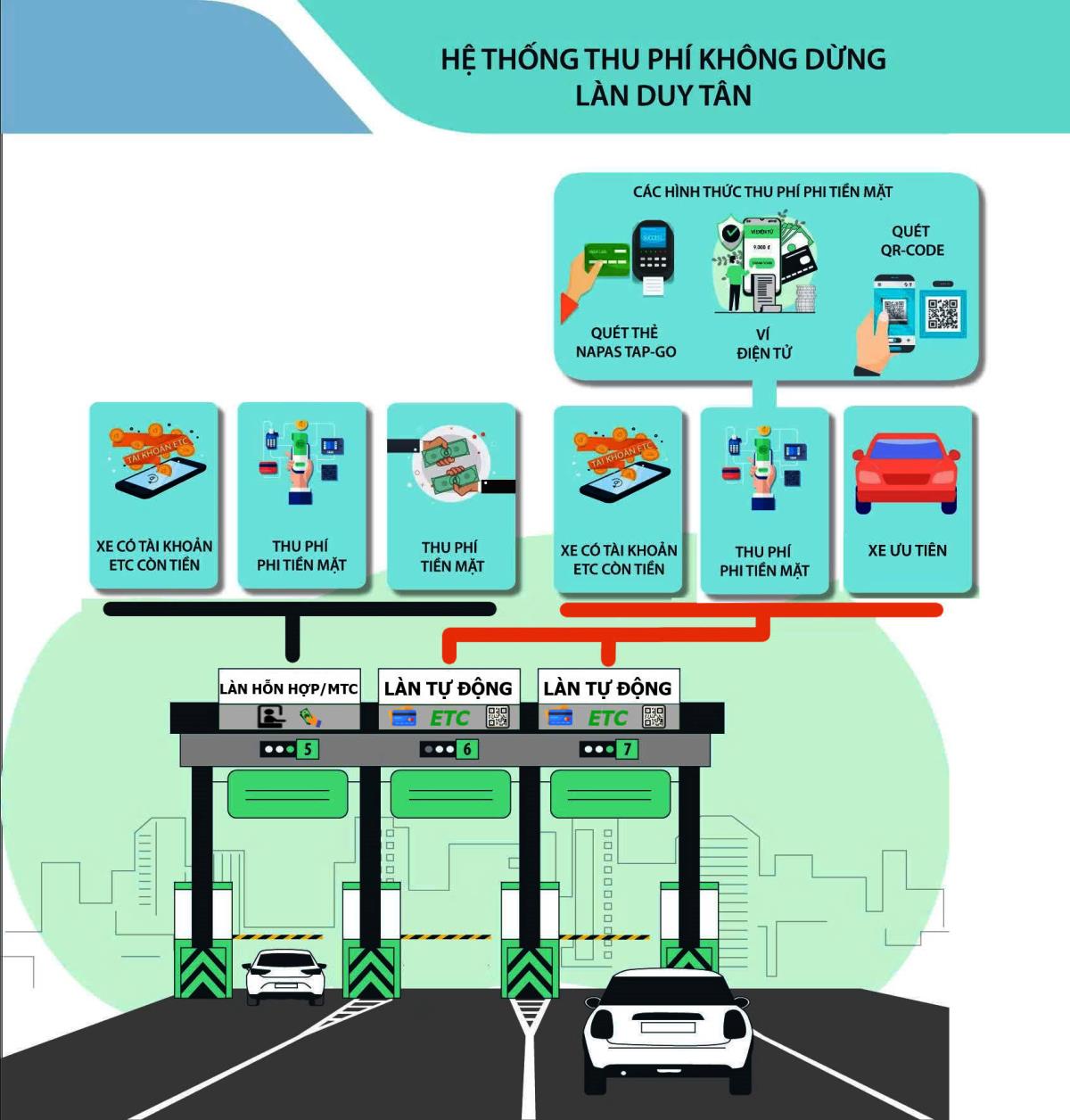Cụ thể, hệ thống triển khai thu phí ra/vào Sân bay Quốc tế Đà Nẵng như sau: về cấu trúc hệ thống làn thu phí, đối với trạm thu phí ở phía đường Nguyễn Văn Linh: Làn 1 và Làn 2 là các làn hỗn hợp (chấp nhận tiền mặt, phi tiền mặt và ETC); Làn 3 và Làn 4 là các làn tự động (phi tiền mặt và ETC). Đối với trạm thu phí ở phía đường Duy Tân: Làn 5 là làn hỗn hợp; Làn 6 và Làn 7 là các làn tự động. Về các phương thức thanh toán tại làn tự động: Thẻ ETC hợp lệ (e-Tag của VETC hoặc VDTC ePass); Mã QR (qua ví điện tử hoặc ứng dụng ngân hàng); Thẻ nội địa NAPAS (chạm để thanh toán, không cần nhập mã PIN).