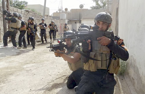 | Các thành viên Lực lượng đặc nhiệm Iraq tuần tra, tìm kiếm vật liệu nổ và vũ khí của phe ISIS ở Ramadi. Ảnh: Reuters |