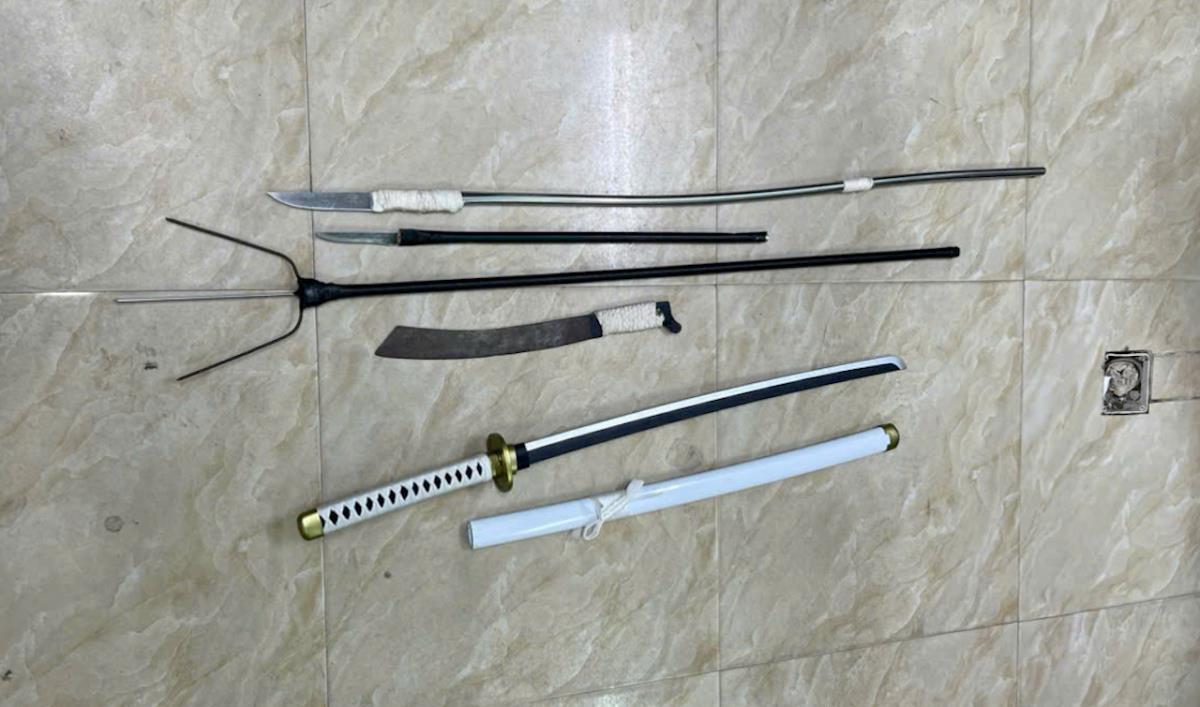 Đặc biệt, trong quá trình mật phục, trinh sát Phòng Cảnh sát hình sự đã phát hiện 3 vụ việc liên quan đến hành vi tàng trữ trái phép vũ khí thô sơ. Tang vật thu giữ gồm nhiều loại hung khí nguy hiểm như dao phóng lợn, dao tự chế, kiếm Nhật, ná cao su và các công cụ hỗ trợ khác. Đây là những vật dụng tiềm ẩn nguy cơ cao dẫn đến các vụ việc gây rối trật tự công cộng, thậm chí là các hành vi cố ý gây thương tích nếu không được ngăn chặn kịp thời.