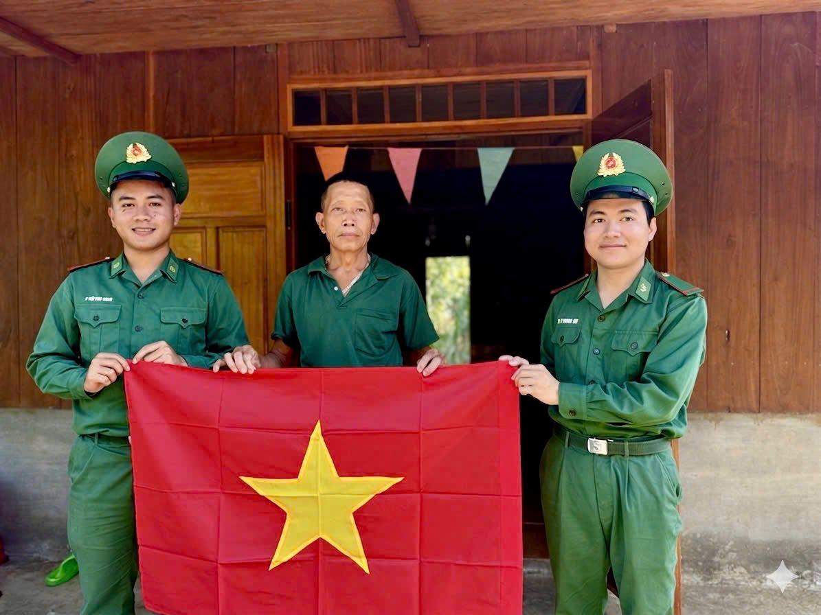 Đoàn viên Bộ đội Biên phòng tặng Cờ Tổ quốc cho các hộ dân.