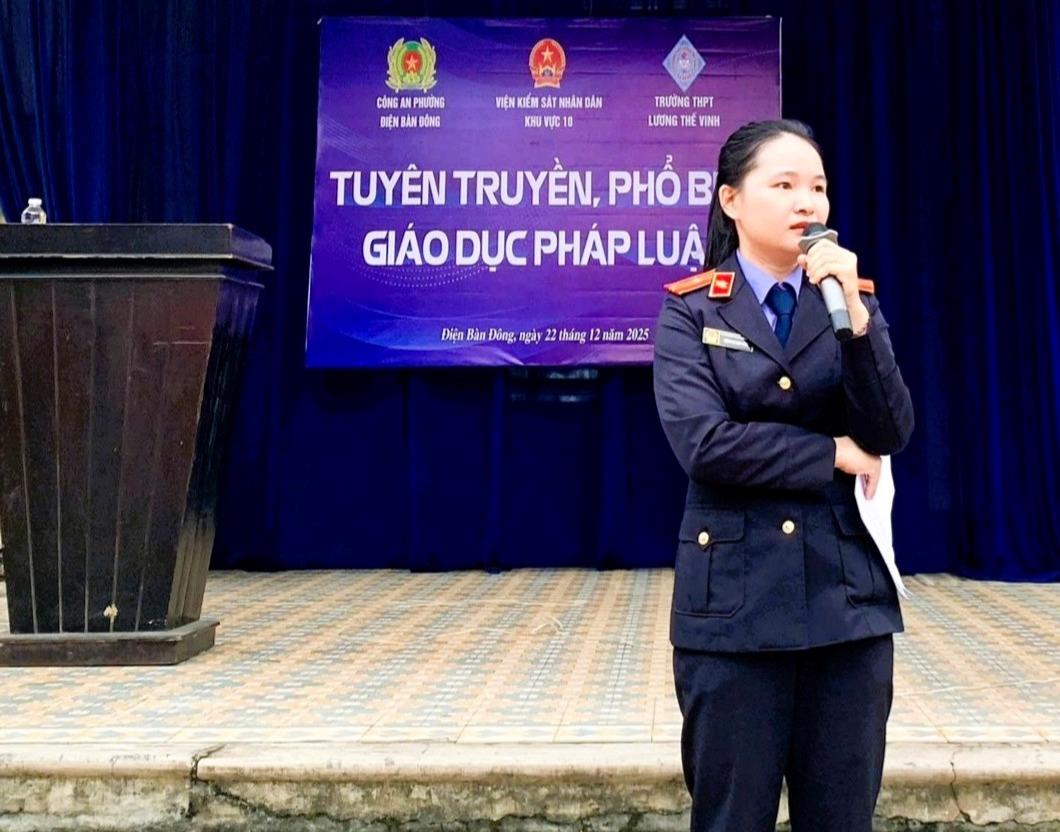 Ngày 23-12, Công an phường Điện Bàn Đông phối hợp Viện Kiểm sát nhân dân khu vực 10 thành phố Đà Nẵng tổ chức buổi tuyên truyền giáo dục pháp luật cho gần 1.000 giáo viên, học sinh Trưởng THPT Lương Thế Vinh, Đà Nẵng.