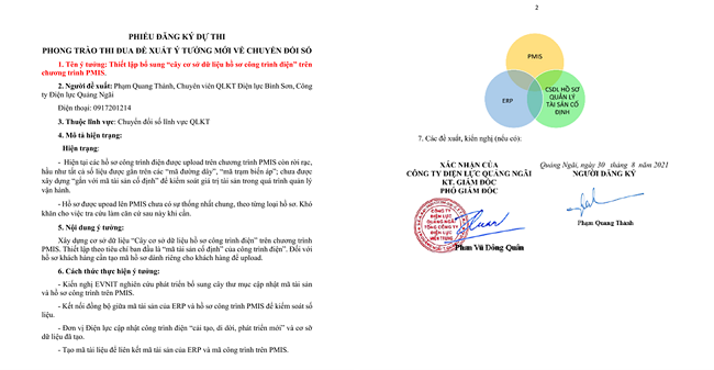 Dựa trên nền tảng đó, PC Quảng Ngãi cũng đã có ý tưởng và nghiên cứu tích hợp bổ sung tính năng ký số dùng EVNCA vào phần mềm quản lý lương của Công ty; qua đó, góp phần hoàn thành nhiệm vụ "Văn phòng số (Chữ ký số)" trong kế hoạch chuyển đổi số của EVNCPC.