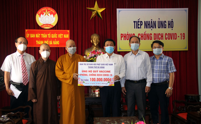 Sáng ngày 29-7, Hòa Thượng Thích Thiện Toàn - Uỷ Hội đồng Trị sự (HĐTS), Phó ban Thường trực Ban Trị sự Giáo hội Phật giáo Việt Nam (BTS GHPGVN) TP Đà Nẵng, Thượng Tọa Thích Thông Đạo - UV HĐTS, Phó ban kiêm Chánh thư ký BTS GHPGVN TP Đà Nẵng thay mặt GHPGVN TP Đà Nẵng đã đến trao 100 triệu đồng ủng hộ Quỹ vắc-xin phòng, chống dịch COVID-19 cho đơn vị tiếp nhận là Ủy ban Mặt trận Tổ quốc Việt Nam (UBMTTQVN) TP Đà Nẵng.