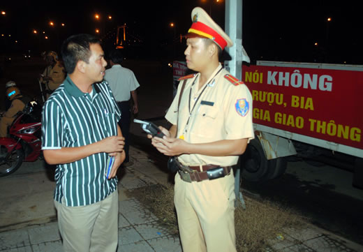 | Rất nhiều người dù đã sử dụng bia rượu nhưng cứ "chối đây đẩy" khi được yêu cầu đo nồng độ cồn. Trong ảnh: CSGT CATP Đà Nẵng giải thích cho người điều khiển phương tiện trước khi thực hiện đo nồng độ cồn. |