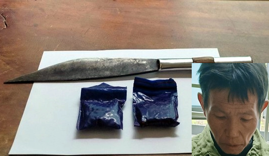 Đối tượng May cùng hung khí và 2 gói ma túy tang vật.