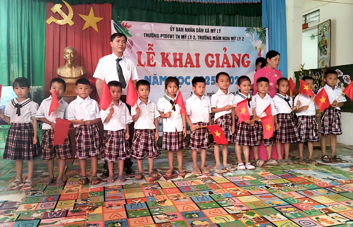 Tại xã biên giới Mỹ Lý (Nghệ An), hơn 300 em HS Trường MN Mỹ Lý 2 và Trường Phổ thông DTBT Tiểu học Mỹ Lý 2 đến Trường MN Mỹ Lý 2 để dự Lễ khai giảng. Bởi, do ảnh hưởng của trận mưa lũ lịch sử cuối tháng 7, điểm trường chính của trường Tiểu học Mỹ Lý 2 tại bản Xằng Trên bị lũ tàn phá, không còn lớp học nên hai trường này đã tổ chức Lễ khai giảng chung cho các em HS.