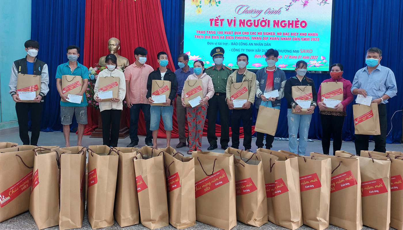 Ông Phạm Thanh Tùng-Giám đốc Công ty TNHH Sai Ko cũng bày tỏ, là một doanh nghiệp hoạt động sản xuất kinh doanh tại địa bàn Quảng Nam và miền Trung, hàng năm Công ty luôn dành một phần quỹ phúc lợi cho hoạt động thiện nguyện, giúp đỡ những hoàn cảnh, trường hợp cá nhân, các hộ gia đình bà con nhân dân còn nhiều khó khăn, nhất là các gia đình chính sách, neo đơn, ốm đau bệnh tật…Trong chuyến về với bà con nghèo ở Điện Phương trước thềm xuân mới Nhâm Dần này, Báo Công an nhân dân, Công ty TNHHSai Ko đã gửi tới bà con hơn 100 xuất quà với mong muốn san sẻ hỗ trợ cùng bà con có một cái tết đầm ấm trong mùa xuân mới.