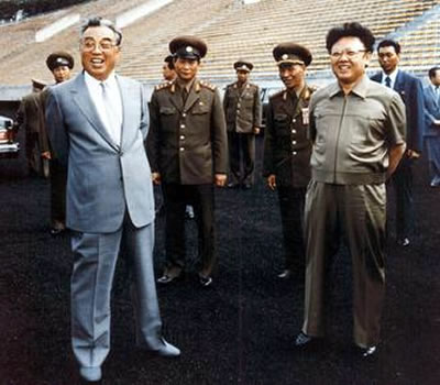 Ông Kim Nhật Thành (trái) và con trai Kim Jong-Il (phải) đi kiểm tra một sân vận động tại Bình Nhưỡng năm 1992. |