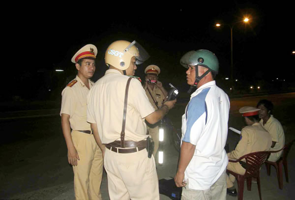 | Lực lượng CSGT CAH Hòa Vang kiểm tra nồng độ cồn người điều khiển xe máy, đảm bảo TTATGT. |