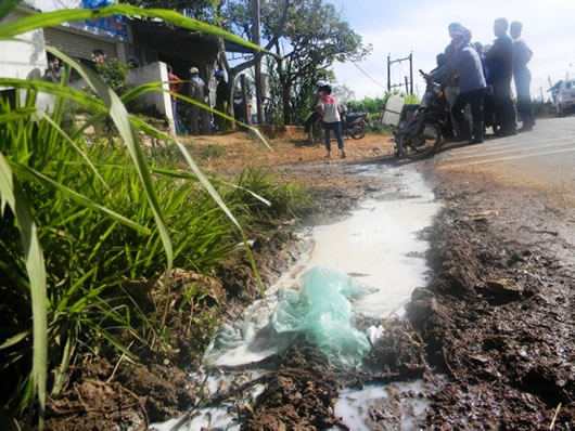 Người dân đắng lòng đổ sữa vì nhà máy không mua. |