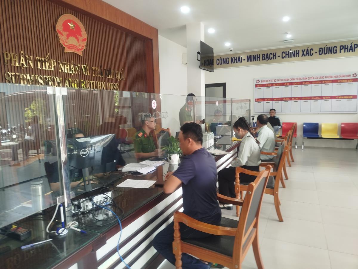 Tại Công an phường Hòa Khánh, có trụ sở tại địa chỉ 843 Tôn Đức Thắng, bộ phận tiếp dân cũng diễn ra khá sôi động. Tại đây, mỗi CBCS đều bắt tay vào việc ngay từ đầu giờ ở tất cả 5 quầy được bố trí. Một điều khá thuận lợi cũng giống như tại Công an phường Thanh Khê là đơn vị được thừa hưởng phòng ốc của bộ phận tiếp nhận và trả kết quả của UBND phường Hòa Khánh Nam (cũ) nên mọi việc diễn ra khá thuận lợi. Tuy nhiên, do nhận bàn giao muộn nên đơn vị vừa phải lắp đặt thiết bị để vận hành, vừa phải bố trí cán bộ tiếp và giải quyết công việc cho người dân.