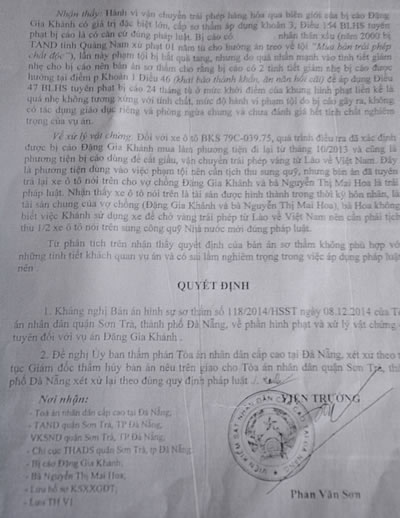 Tại Bản cáo trạng số 111/2014/QĐ-VKS, ngày 10-11-2014, VKSND Q. Sơn Trà đã truy tố Khánh về tội "Vận chuyển trái phép hàng hóa qua biên giới" theo khoản 3 điều 154 Bộ luật Hình sự với khung hình phạt từ 5-10 năm tù. Tuy nhiên Bản án số 118/2014/HSST, ngày 8-12-2014, của TAND Q. Sơn Trà chỉ tuyên phạt Khánh với mức án 2 năm tù. Về xử lý vật chứng, tòa tuyên trả lại ô-tô mà Khánh dùng vận chuyển số vàng từ Lào về Việt Nam.