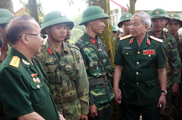 | Trung tướng Ma Thanh Toàn (ngoài cùng bên phải) với cán bộ, chiến sĩ Trung đoàn 95. |