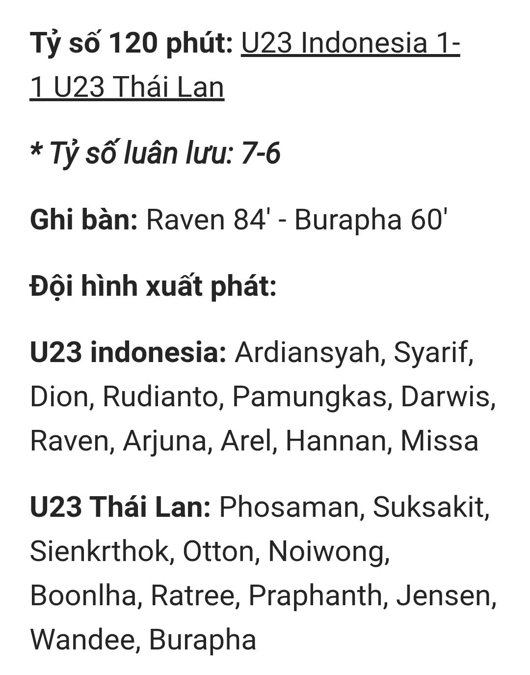 Trong màn "đấu súng" cân não, U23 Thái Lan có tới 2 cầu thủ thực hiện không thành công lượt đá của mình, còn U23 Indonesia chỉ có 1 người sút hỏng và giành chiến thắng 7-6. Như vậy, U23 Indonesia ghi danh vào chung kết U23 Đông Nam Á gặp U23 Việt Nam vào 20h ngày 29/7.
