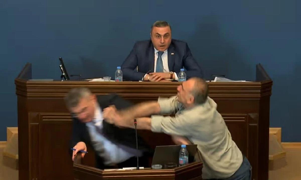 Đoạn phim phát sóng hôm 15-4 trên truyền hình Georgia cho thấy ông Mamuka Mdinaradze, lãnh đạo Đảng Giấc mơ Georgia tại nghị viện, bị nghị sĩ phe đối lập Aleko Elisashvili đấm vào mặt khi đang phát biểu.