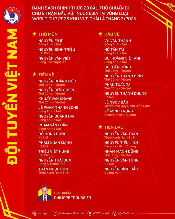 HLV Philippe Troussier vừa chính thức công bố danh sách 28 tuyển thủ Việt Nam chuẩn bị lên đường đấu Indonesia ở vòng loại thứ hai World Cup 2026 khu vực châu Á.