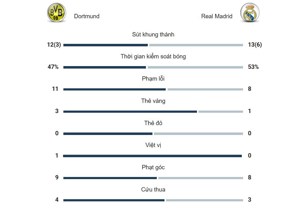 Tỷ số trận đấu: Dortmund 0-2 Real Madrid (hiệp 1: 0-0)