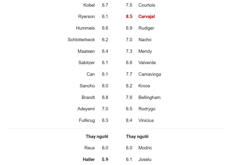 Từ đầu hiệp 2 Dani Carvajal đã xuất hiện trong vòng cấm Dortmund nhiều hơn thường lệ, anh đánh đầu chệch cột dọc phút 50 trong một quả phạt góc trước khi vô-lê nguy hiểm sau đó 7 phút. Phía Dortmund không hề có giải pháp cho lão tướng 32 tuổi và ở phút 74 họ đã trả giá, Kroos đá phạt góc và Carvajal đã tách ra khỏi Fullkrug để đánh đầu chéo góc ở cột gần, ngay cả Hummels tuyệt vọng dùng tay đẩy bóng cũng không ngăn được bàn thua.