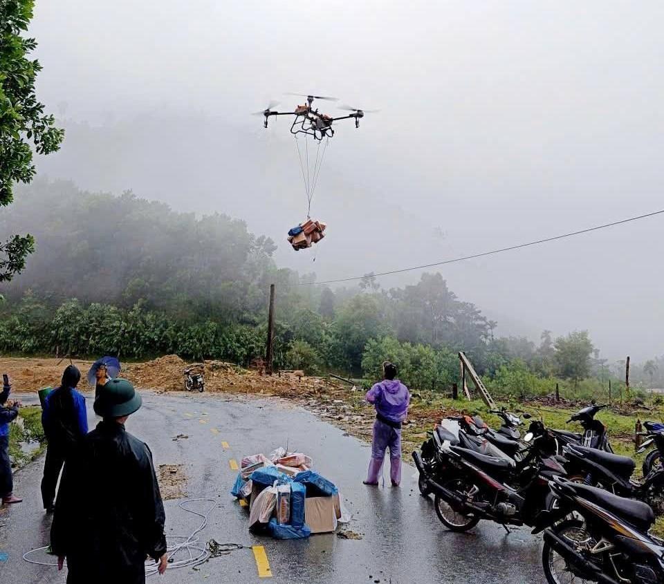 Do địa hình chia cắt, sạt lở nghiêm trọng, nhiều điểm dân cư không thể tiếp cận bằng phương tiện cơ giới, các đơn vị bộ đội đã linh hoạt sử dụng Drone vận chuyển hàng cứu trợ tiếp tế cho người dân bị cô lập.