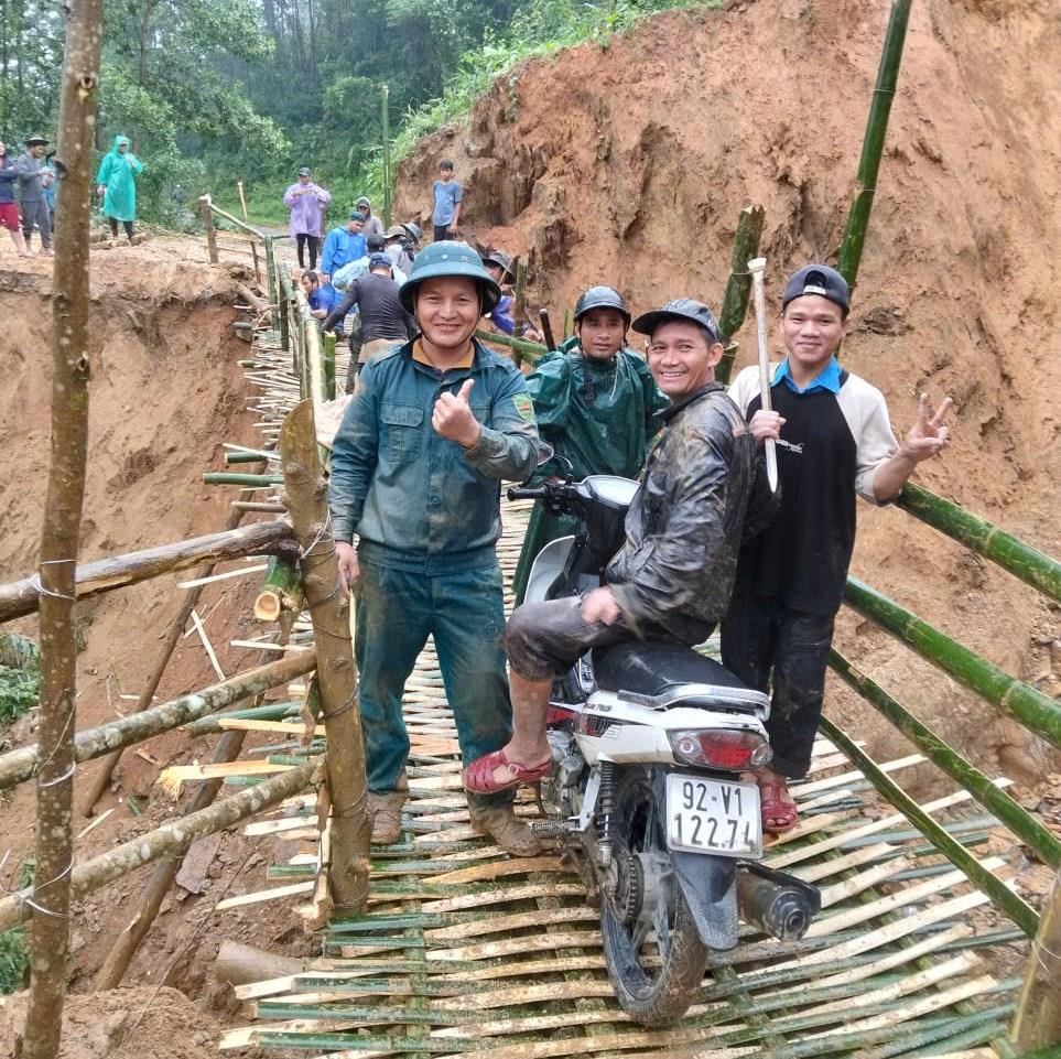 Đường ĐH8 trên địa bàn xã Trà Đốc (TP Đà Nẵng) đi vào xã Trà Bui cũ bị sạt lở nghiêm trọng. Có nhiều đoạn đường bị lũ cuốn trôi, đứt cả nền đường dài hàng chục mét, xe cơ giới chưa thể tiếp cận được. Vì vậy người dân địa phương đã tự làm cầu tạm để có thể qua lại, thuận tiện cho việc đưa đón học sinh đến trường.