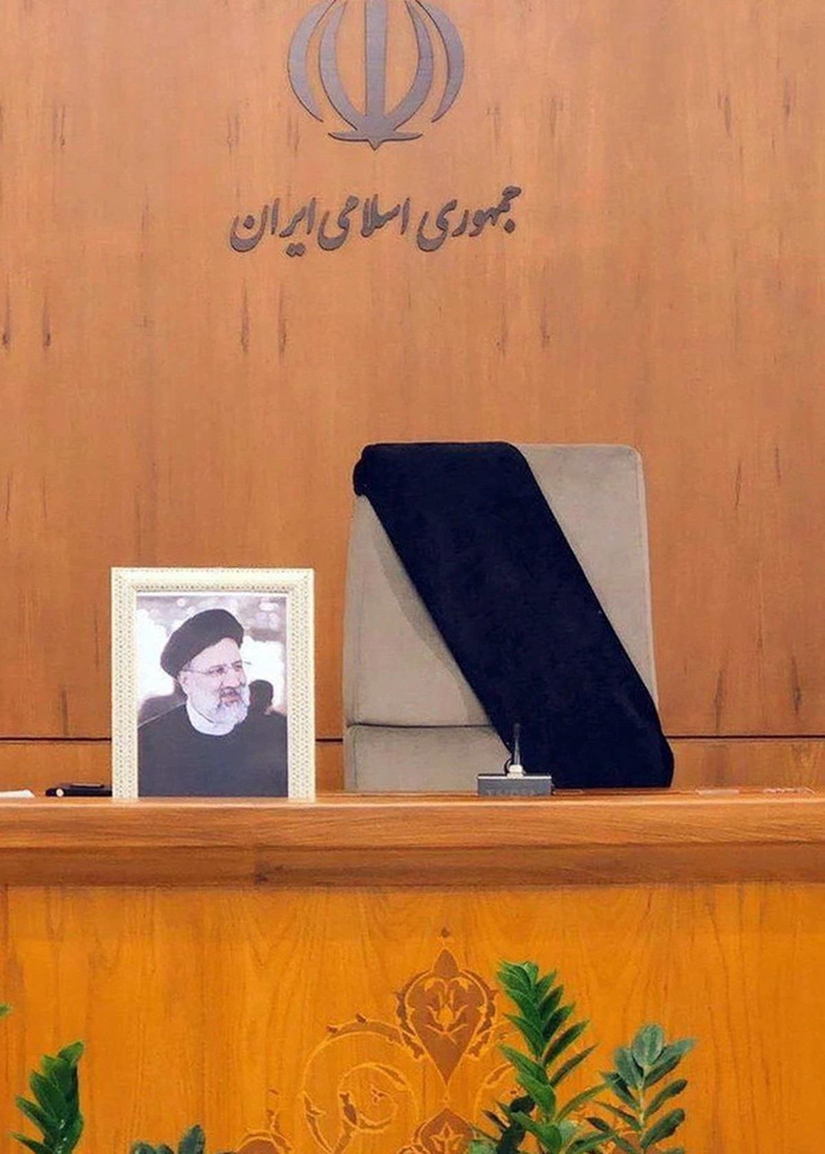 Chiếc ghế nơi ông Raisi thường ngồi đã được quấn băng đen - Ảnh: ISNA
