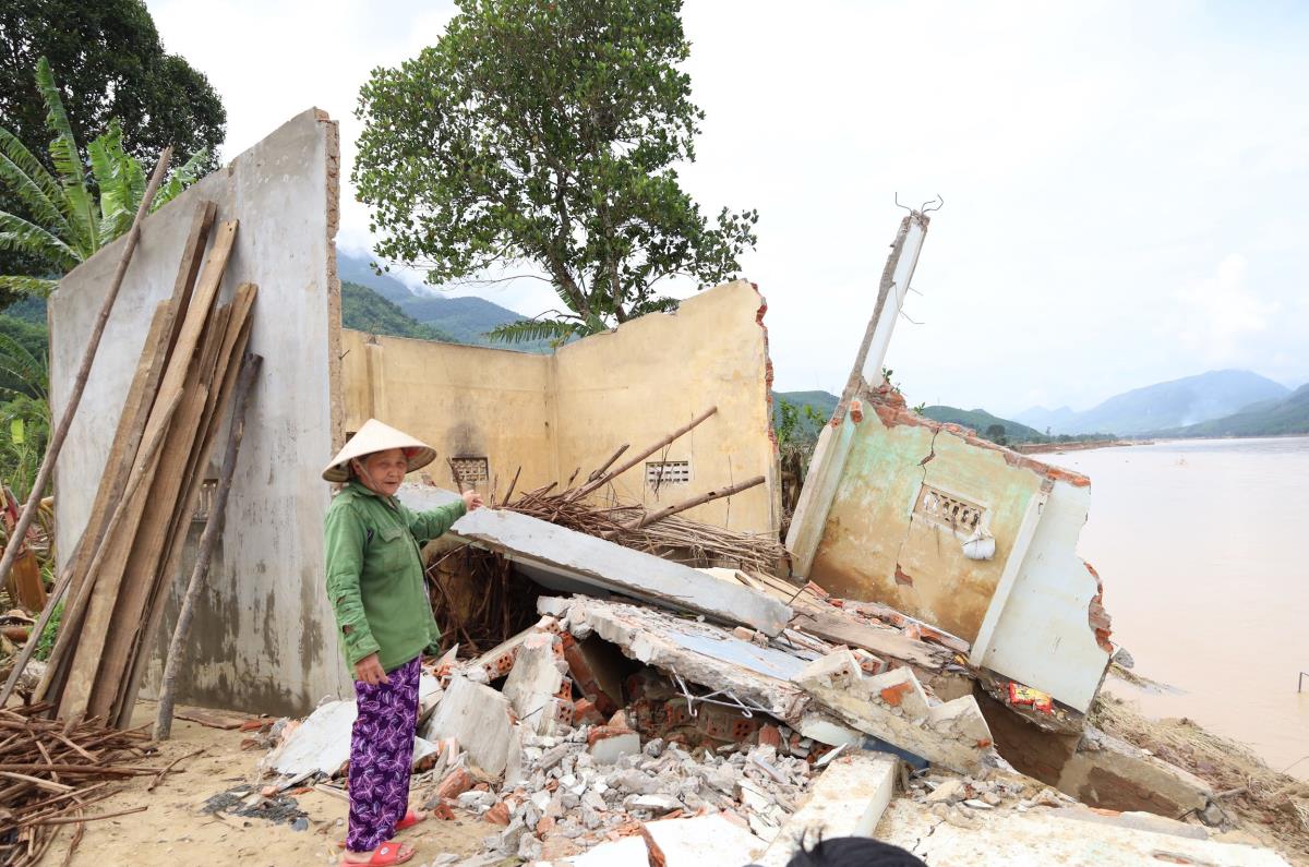 Bà Mãn thẩn thờ bên căn nhà bị lũ cuốn trôi.