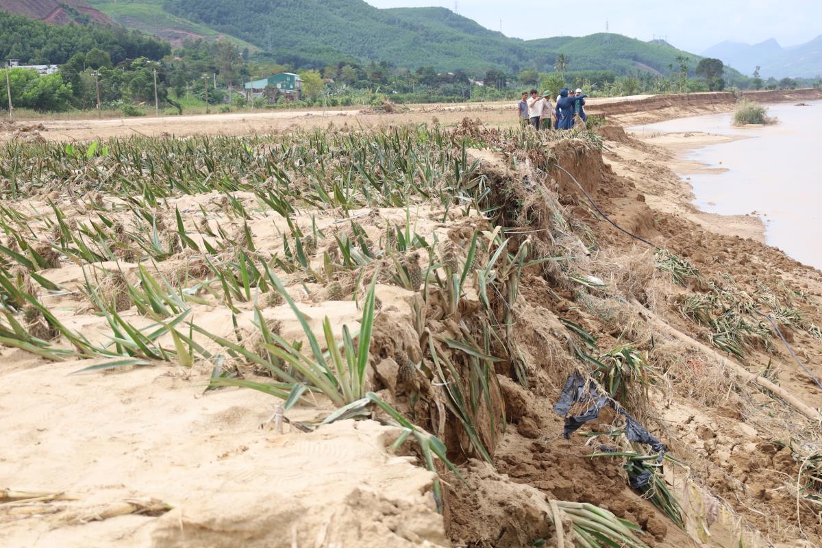 Còn ông Lê Vinh (thôn Hòa Hữu Đông) - chủ Hợp tác xã Bồn Mùa Eco Farm cho biết, ông thuê 4,1ha đất của người dân để mở hợp tác xã, trồng tổng cộng 1.000 cây bưởi, 500 cây ổi, 200 cây xoài, 30.000 cây thơm nhưng tất cả đã bị xóa sổ. “Chừ còn lại mười mấy cây xoài nằm đó mà cũng sắp chết, không còn gì trên đất hết. Đồng này chưa bao giờ lở, chỉ bồi, mà giờ lở gần 100 mét, do nước thủy điện đổ về quá lớn” ông Vinh chia sẻ, đồng thời cho biết thêm, theo bảng kê khai gửi xã, thiệt hại tài sản của mình hơn 500 triệu đồng, chưa tính công sức bỏ ra.